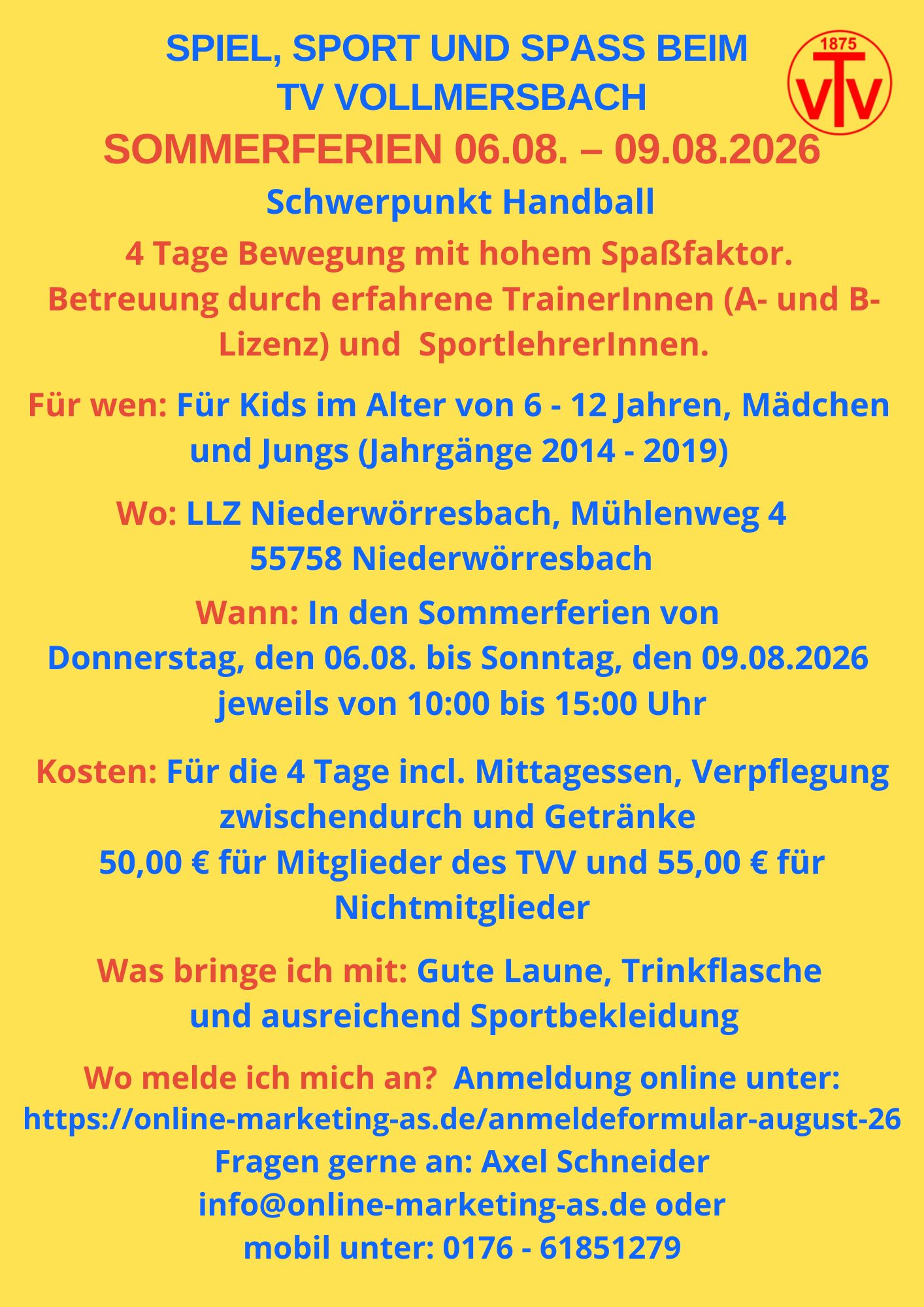 Sportcamp TVV, Name des Kindes, Mitglied TVV ja/nein