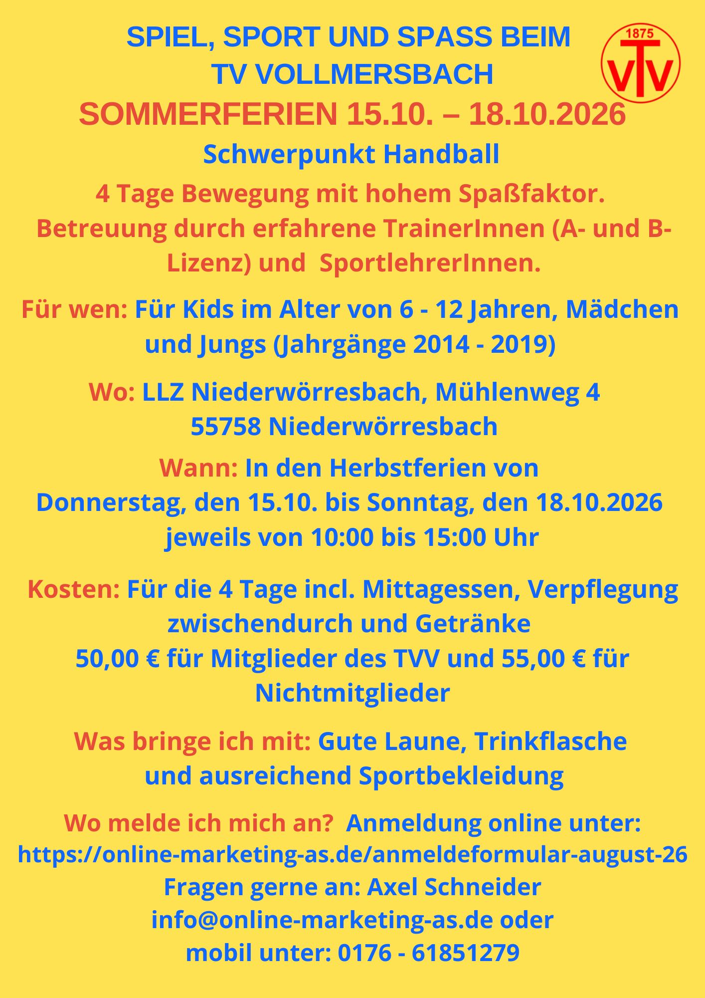 Sportcamp TVV, Name des Kindes, Mitglied TVV ja/nein